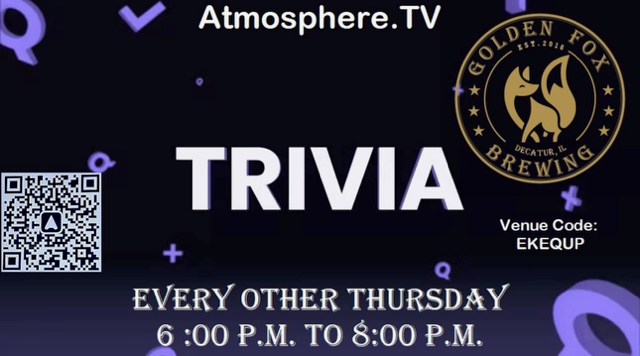 Interactive Trivia now on Thursdays we do not have live hosted Trivia. Come in anytime between 6pm and 8pm, play as many 10 question games as you wish. After each 10 question game a winner at Golden Fox will appear on the screen…A prize winner every game. Free to play. Just add the app to your phone with the QR code and the location ID and you are in.